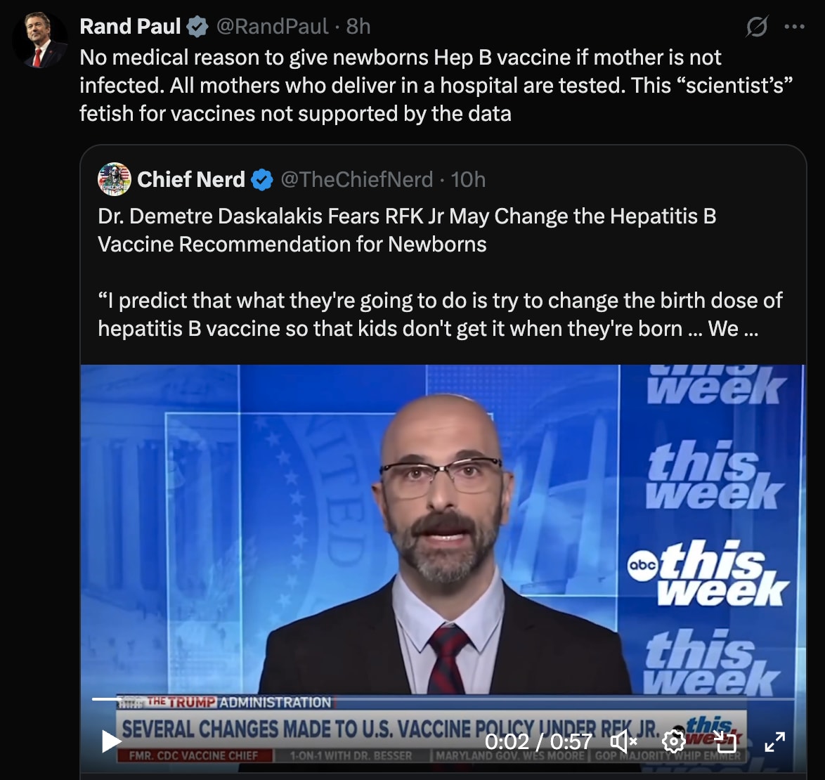 After Dr. Demetre Daskalakis’s stark warning about the hepatitis B shot on ABC, Senator Rand Paul — a physician himself — fired back with a sharp rebuttal that cut him down in just a few sentences.