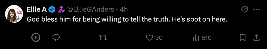 Ellie A said: “God bless him for being willing to tell the truth. He’s spot on here.”
