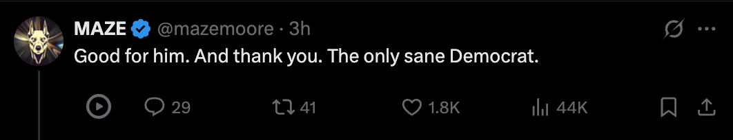 Popular X account @mazemoore responded to Fetterman’s words, saying, “Good for him. And thank you. The only sane Democrat.”